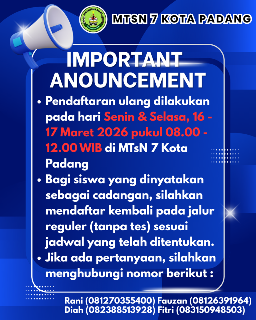 Semoga website ini dapat menjadi sarana yang efektif untuk mendukung kemajuan pendidikan di MTsN 7 Kota Padang. Mari kita manfaatkan platform ini dengan sebaik-baiknya demi keberhasilan bersama.