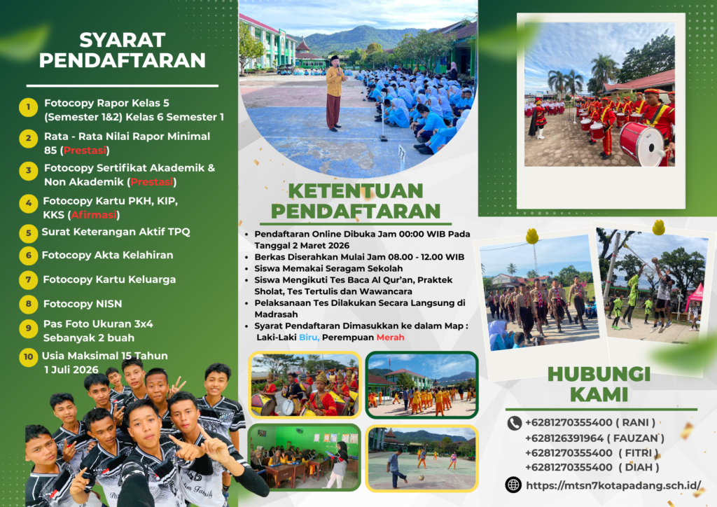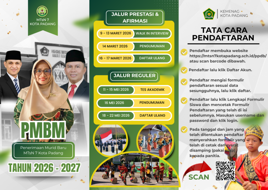 Kabar gembira! Penerimaan Murid Baru di MTsN 7 Kota Padang telah resmi dibuka. Kami mengundang putra-putri Ayah & Bunda untuk bergabung dalam lingkungan belajar yang aman, nyaman, dan berorientasi pada prestasi serta memperdalam ilmu agama sekaligus meraih prestasi akademik. 🌙✨