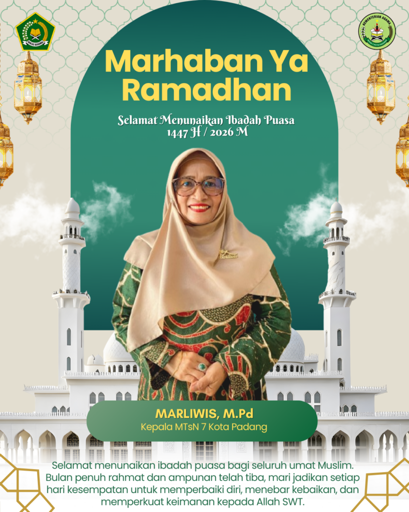 Seluruh Keluarga Besar MTsN 7 Kota Padang mengucapkan Selamat Menunaikan Ibadah Puasa 1447 H bagi seluruh umat Muslim. Semoga Ramadhan tahun ini menjadi momentum untuk meningkatkan etos kerja dalam balutan ketakwaan.”