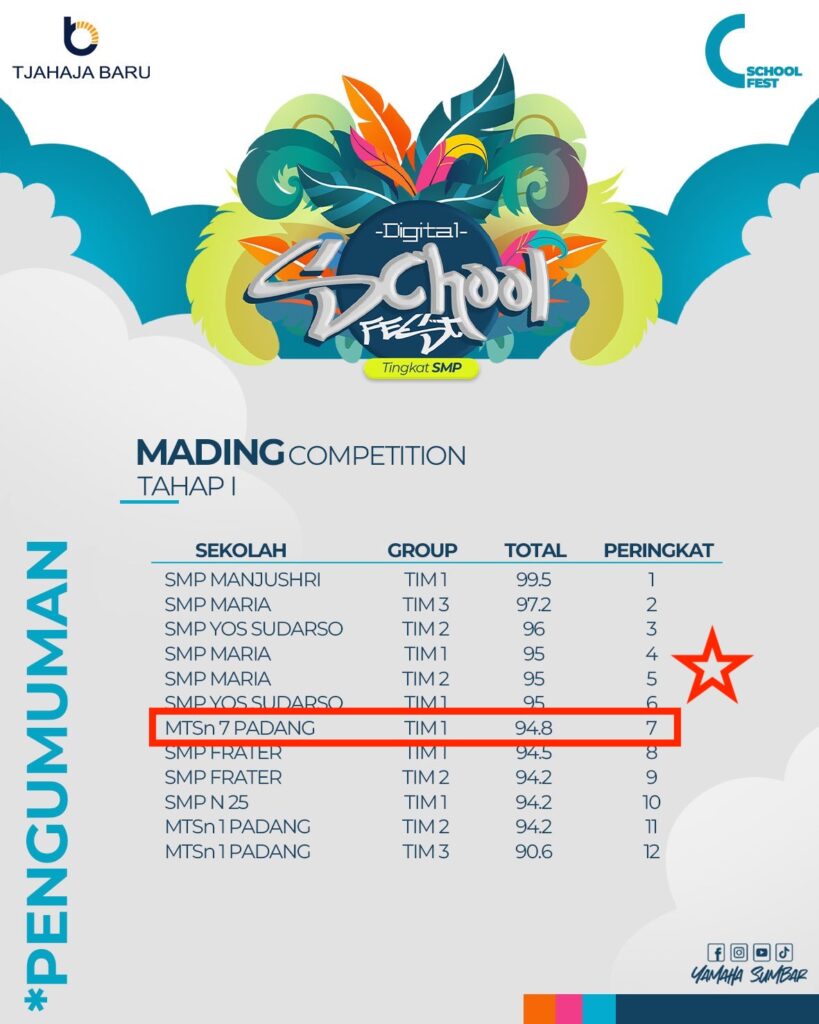 MTsN 7 Kota Padang (Humas) – Prestasi membanggakan kembali diukir oleh Tim Majalah Dinding (Mading) MTsN 7 Kota Padang. Tim Mading sekolah tersebut berhasil melaju ke Tahap Dua dalam ajang kompetisi bergengsi Yamaha ‘Digital School Fest’ yang mengangkat tema besar tentang digitalisasi di lingkungan sekolah. Lomba yang diselenggarakan oleh Yamaha ini diikuti oleh puluhan MTs dan SMP se-Kota Padang. Dalam pengumuman hasil Tahap Pertama, Tim Mading MTsN 7 Padang berhasil menunjukkan kreativitas luar biasa dan lolos dengan menduduki Peringkat ke-7 di antara 12 tim terbaik yang berhak melanjutkan kompetisi.