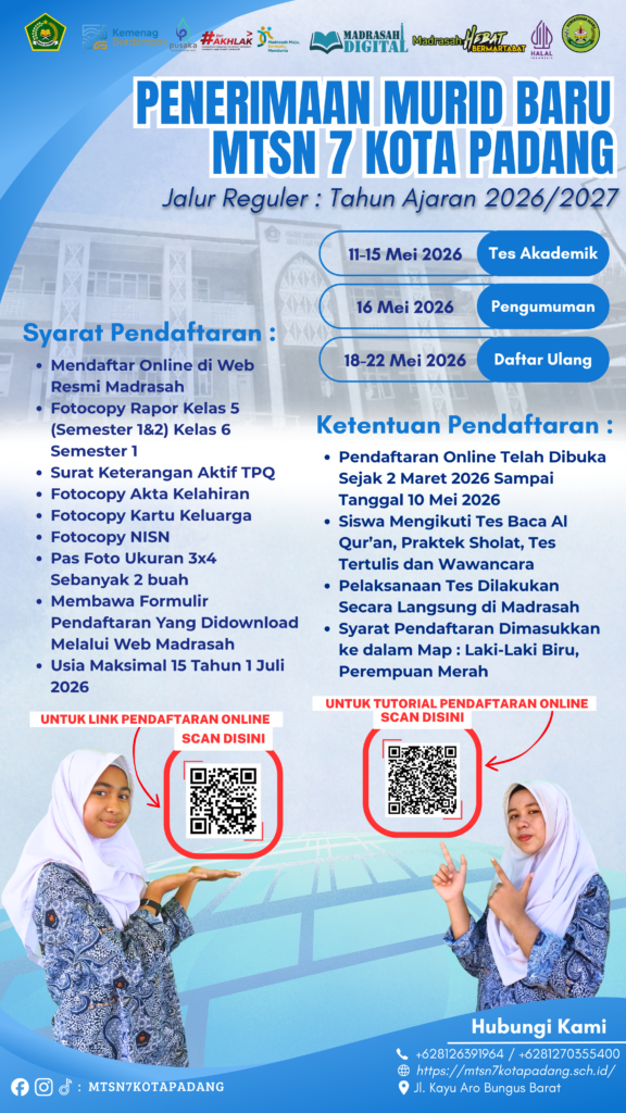 Masa depan cerah dimulai dari langkah yang tepat. Kami mengundang putra-putri terbaik untuk bergabung menjadi bagian dari keluarga besar MTsN 7 Kota Padang melalui Jalur Reguler PMBM! ![]()