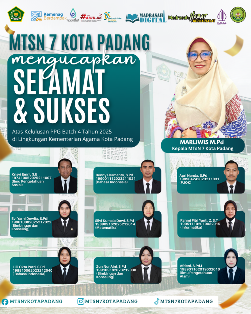 Selamat dan sukses atas kelulusan Bapak/Ibu Guru MTsN 7 Kota Padang pada PPG Batch 4 Tahun 2025. :